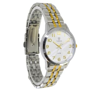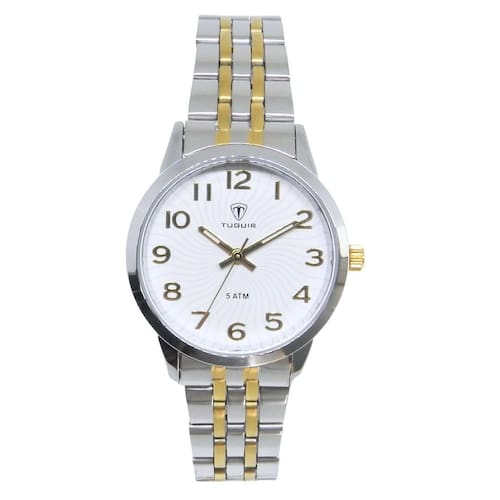 Marca: Tuguir Categoria: Analógico Analógico: Sim (1 Horário) Ponteiros Fluorescentes: Não Digital: Não Luz: Selecione Resistente à Água: 5 ATM - Respingos: Sim - Chuva: Sim - Lavar Carro: Sim - Lavar Louça: Sim - Natação: Sim - Mergulho: Não Característica do Vidro: Cristal Mineral Tipo de Fecho: Dobrável com Botão Cor da Caixa: Prata Material da Caixa: Metal Banho IP Formato da Caixa: Redondo Diâmetro da Caixa: 32,00 (mm) Espessura da Caixa: 9,00 (mm) Cor da Pulseira: Prata Material da Pulseira: Aço Largura da Pulseira: 13,50 (mm) Comprimento Máximo da Pulseira: 260,00 (mm) Alimentação: Bateria Interna Peso Líquido: 0,060 Kg Modelo: 9182C Cor Predominante: Prata Cor Diferencial: Dourado Garantia: 12 Meses