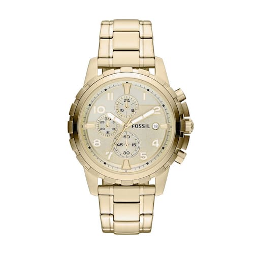 Fossil Relógio social masculino Dean com mostrador cronógrafo e pulseira de aço inoxidável, Dourado, FS4867IE - Inspirando-se no modernismo de meados do século, as linhas simples e a forma clássica de Dean produzem um efeito sutil, mas visualmente impressionante. Com uma caixa e pulseira de aço inoxidável dourado, este cronógrafo versátil pode levar você do dia à noite com facilidade. - Caixa e movimento: caixa de 45 mm, largura de banda de 22 mm, lente de cristal mineral endurecido resiste a arranhões, movimento preciso de quartzo com mostrador analógico de cronógrafo e janela de data, três submostradores para rastrear minutos, segundos e tempo de 24 horas, funcionalidade de cronômetro, importado. - Mostrador: Caixa redonda de aço inoxidável dourado, com mostrador dourado e detalhes. - Pulseira de relógio: pulseira dourada de aço inoxidável durável com fecho dobrável seguro; os elos podem ser removidos para um ajuste personalizado; intercambiáveis com todas as pulseiras Fossil de 22 mm. - Resistente à água: até 50 m: pode ser utilizado para curtos períodos de natação recreativa e banho, mas não para mergulho ou snorkeling; 5 ATM.