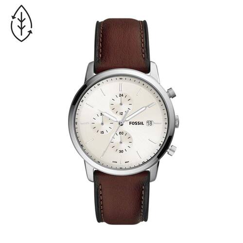 A coleção Minimalist Chrono traz um design clássico e super elegante. O relógio cronógrafo tem uma caixa redonda prateada de aço de 42mm, pulseira de couro marrom escuro o e mostrador branco super elegante. Além disso, ele tem resistência de até 5 atm e calendário branco no mostrador. Uma coleção estilosa e com muitas funcionalidades, características ímpar para marca Fossil.