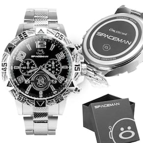 O design impecável do Spaceman destaca-se pelo contraste elegante entre o aço prata e o fundo preto, conferindo uma estética atemporal e distinta. A pulseira prata, com fecho dobrável e trava, não apenas adiciona um toque de luxo, mas também assegura um ajuste seguro e confortável, tornando este relógio a escolha ideal para diversas ocasiões, desde eventos formais até encontros mais descontraídos.