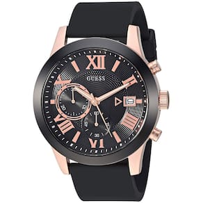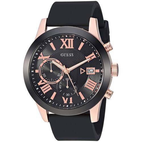 GUESS Relógio com cronógrafo de aço inoxidável, Preto/tom de ouro rosa/preto, ATLAS - Mostrador cronógrafo preto com janela de data e números romanos em tom de ouro rosa - Características: Relógio cronógrafo com janela de função de data - Tamanho da caixa de 44,5 mm com cristal mineral durável que protege o relógio de arranhões - Caixa de aço inoxidável escovado em tom de ouro rosa com anel superior preto - Pulseira de silicone preta confortável resistente a manchas com fecho de fivela em tom de ouro rosa - Resistente à água até 50 metros - Movimento de quartzo japonês. Bateria incluída