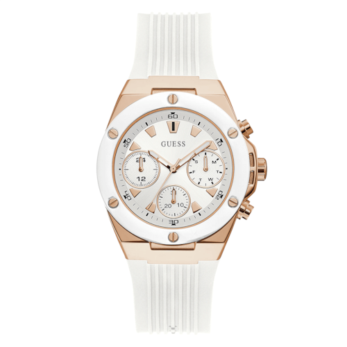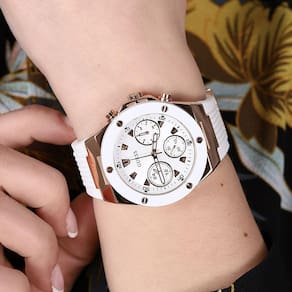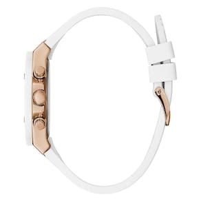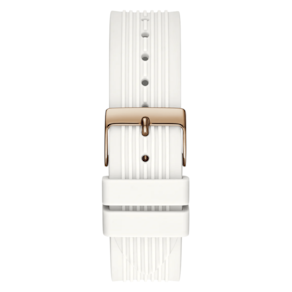 Características Formato do Relógio: Redondo Composição do Vidro: Cristal mineral Material da Caixa: Aço Inox Cor da Caixa: Branco, Rosê Cor do mostrador: Branco, Rosê Material da Pulseira: Borracha Cor da Pulseira: Branco Mecanismo: Analógico Multifunção