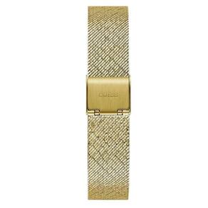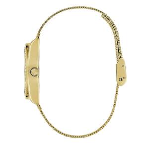 O aro cravejado com cristais completa o visual luxuoso, enquanto a pulseira mesh em aço inoxidável dourado garante conforto, leveza e ajuste moderno.