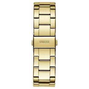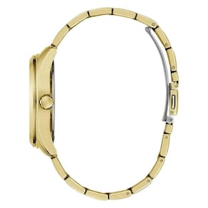 A pulseira em aço inoxidável dourado, robusta e elegante, proporciona segurança e conforto, completando o visual refinado que combina tanto com produções casuais quanto formais.