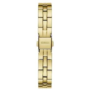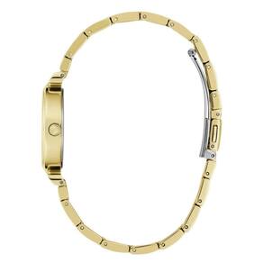 A pulseira em aço inoxidável dourado é um dos diferenciais, trazendo elos clássicos e detalhes cravejados em cristais próximos à caixa, elevando ainda mais a sofisticação do modelo.