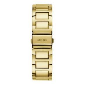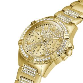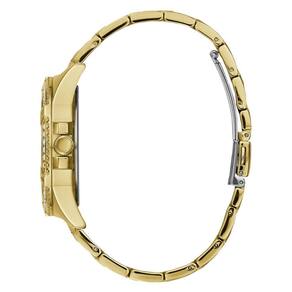 A pulseira em aço inoxidável dourado também recebe aplicação de cristais nos elos centrais, elevando ainda mais o brilho e a sofisticação.