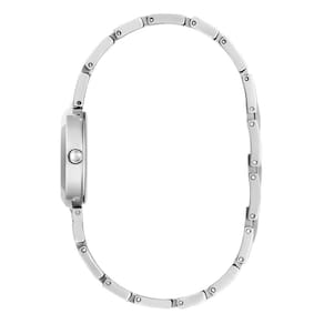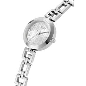 Com caixa de 26mm, o modelo tem proporções discretas e femininas, ideais para quem prefere relógios menores e confortáveis. O mostrador prateado traz textura com o icônico monograma G da Guess, acrescentando identidade e estilo ao design clean.