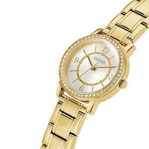 Mecanismo: Analógico (Quartzo) Gênero: Feminino Visor: Branco Vidro: Cristal mineral Prova d'água: 30m Características: caixa com cristais cravejados. Diâmetro da caixa: 28 mm Tipo de fecho: Gancho Garantia: 1 ano pela fabricante Guess