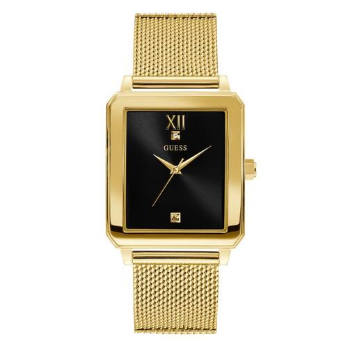 Relógio de pulseira retangular de malha de aço inoxidável e dourado GUESS com mostrador de diamante preto genuíno. Cor: dourado (modelo: U1074G3) - MOSTRADOR EM DIAMANTE PRETO - Características: mostrador de diamante genuíno - TAMANHO DA CAIXA DE 35 MM COM CRISTAL MINERAL DURÁVEL que protege o relógio contra arranhões - CAIXA EM AÇO INOXIDÁVEL POLIDO EM TOM DOURADO - PULSEIRA DE MALHA DOURADA DE AÇO INOXIDÁVEL COM FECHO DE FIVELA PILOTO - RESISTENTE À ÁGUA ATÉ 30 metros/100 PÉS - Movimento de quartzo japonês. Bateria incluída