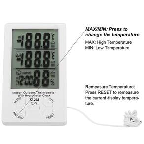 Características Principais: Medida de Temperatura e Umidade: O TA298 combina a medição de temperatura interna e externa com a exibição simultânea da umidade, oferecendo um controle completo do ambiente. Faixas de Medição: Temperatura Interna: -10C a +50C (14F a 122F) com precisão de 1,0C. Temperatura Externa: -50C a +70C (-58F a 158F) com precisão de 1,0C. Umidade: 20% RH a 99% RH com precisão de 5%.