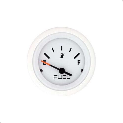 INDICADOR DE COMBUSTÍVEL Universal, 12v. Fundo Branco, com aro plástico branco, Iluminação noturna, ESCALA "E" a "F". Indicado para monitoramento do nível de combustível no tanque através de sensor de nível de 240 ohm.