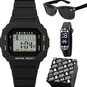 Itens Inclusos: - 1 relógio infantil digital Orizom Kids, formato quadrado, maquinário em acetato, pulseira em silicone ajustável - 1 óculos de sol infantil Orizom Kids, preto, armação em acetato, lentes com proteção UV - 1 relógio infantil digital Orizom Kids, formato bracelete, todo preto, pulseira ajustável em silicone - 1 caixa premium para acomodar os relógios e valorizar o presente