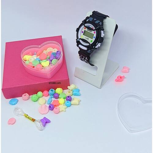 Relógio Infantil Digital Menina Esporte Silicone + Kit Miçangas Coloridas para Montar Colar Pulseiras Anél Fio Silicone - Cor: Preto