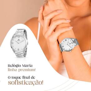 O que está incluso neste kit: - 1 Relógio Feminino Analógico Orizom Maria: Confeccionado em aço inoxidável na cor prata, este relógio possui um design clássico e atemporal, perfeito para completar qualquer look com elegância e charme. - 1 Colar em Aço Inoxidável de 50cm de Comprimento: Um colar delicado e versátil, ideal para diversas ocasiões, adicionando um toque de sofisticação ao visual. - 1 Par de Brincos de Strass e Aço Inoxidável: Brincos deslumbrantes que combinam o brilho do strass com a durabilidade do aço inoxidável, perfeitos para complementar o estilo com um toque de glamour. - 1 Caixa Premium Orizom Maria: Uma caixa elegante e prática, projetada para guardar o relógio e os acessórios com segurança e estilo.