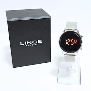 Marca: Lince Modelo: LDM4647L PXSX Tipo de relógio: Digital Gênero: Feminino Cor da caixa: Prateado Cor da pulseira: Prateado Estilo: Casual Alarme: Não Cronômetro: Não Calendário: Sim Luz: Sim – Led Vermelho Resistência à água: 5 ATM = 50 metros Tipo de fecho: Fivela de gancho Material da caixa: Aço Material da pulseira: Aço Características do vidro: Cristal mineral Tamanho da caixa: 37 mm Espessura da caixa: 10 mm Comprimento da pulseira: 22 cm Largura da pulseira: 18 mm Tampa do fundo: Pressão Peso: 70 Gramas Alimentação: Bateria Garantia do Fabricante: 12 meses Fabricante: Orient Relógios da Amazônia LTDA