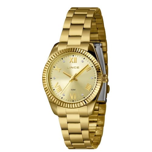 O Relógio Lince Feminino LRGJ170L36 C3KX combina elegância clássica com um design sofisticado e feminino. Com acabamento dourado em toda a peça, o modelo transmite requinte e presença no pulso, enquanto o mostrador dourado cria uma composição harmoniosa e elegante. Os numerais romanos e os marcadores com cristais adicionam um toque de delicadeza e brilho ao design, valorizando ainda mais o visual do relógio.