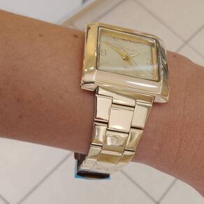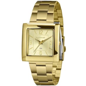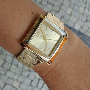 Cor da Caixa: Dourado Cor da pulseira: Dourado Cor do Aro: Douardo Cor do Mostrador:Dourado Material da caixa: Aço Material da pulseira: Aço Pulseira ajustavel: Sim Vidro: Cristal mineral Mecanismo: Analogico Fonte de Energia: Bateria