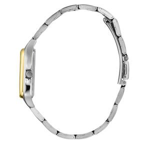 Seu design clássico com caixa quadrada e mostrador com numeração romana transmite sofisticação atemporal, enquanto o contraste entre os tons metálicos adiciona modernidade ao visual. O mostrador claro, aliado aos detalhes dourados, proporciona excelente legibilidade e um toque refinado que valoriza o pulso de forma discreta e elegante.