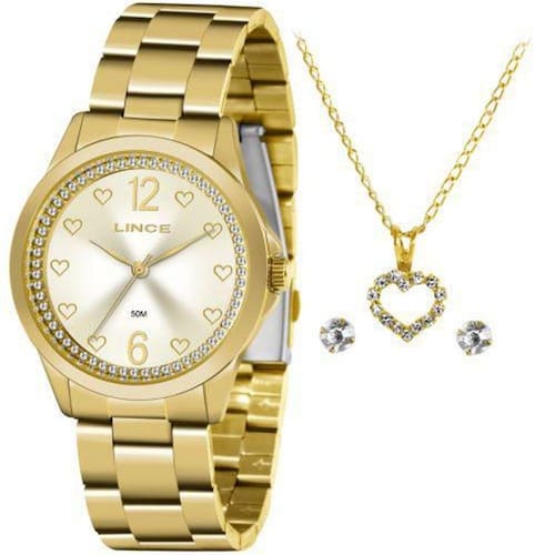 Relógio Lince Feminino LRGJ121LKY83C1KX Dourado Todo o estilo e design moderno da Lince esta~o presentes nesse no Relógio Feminino Lince LRGJ121LKY83C1KX. produzido pela Orient Relógios com materiais resistentes e de qualidade que dão sofisticação e charme, compondo perfeitamente o seu estilo Descrição do RelógioMarca = LinceModelo = LRGJ121LKY83C1KX Genero = Feminino Mostrador = DouradoCaixa = DouradoMecanismo = Analógico Coroa = Botão Fundo = Pressão Resistência à água = 5 ATM (Lavar a Mão / Chuva / Piscina) Vidro = Cristal MineralPeso = 100 gramas Material da caixa = Metal Material da pulseira = Aço Inox Diâmetro da caixa = 38 mm Diâmetro do visor = 33 mm Espessura da caixa = 11 mm Largura da pulseira = 20 mmComprimento da Pulseira = 20 cmFecho = Trava e Botão Fabricante = Orient Relógios da Amazônia LTDAGarantia = Garantia de 1 Ano direto com FabricanteConteúdo da embalagem:01 Relógio de pulso01 Estojo AutênticoManual em portuguêsCerificado de Garantia do FabricanteNota Fiscal Eletrônica