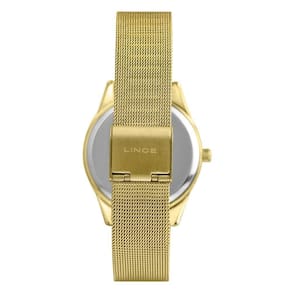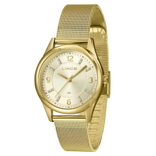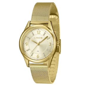 Relógio Lince Feminino Ref: Lrgj178l36 C2kx Casual Mesh Dourado DESCRIÇÃO DO PRODUTO: Caixa: Metal Pulseira: Malha de Aço Mesh Medida da caixa: 36 mm Vidro: Cristal Mineral Resistência à água: 50m Funções: Analógico Mostrador dourado com números e pedras Fundo Alimentação do Maquinário: Bateria Maquinário Japonês de 1 Ano