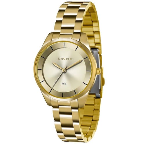 Relógio Lince LRG4446L-C1KX Dourado Tipo de Produto: Relógio Material Externo: Metal Fecho: Implantação Medidas da peça: Medidas da caixa: 3cm de altura e 3cm de largura; Medidas da pulseira: 18cm de comprimento e 2cm de largura; Ocasião: Casual Características Especiais: Material da caixa: Aço inoxidável e Acrílico; Mostrador: Ponteiros de horas, minutos e segundos; Resistência à água: 50m;