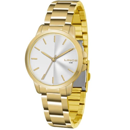 Relógio feminino com sistema analógico com ponteiros indicando as horas, minutos e segundos. Caixa em metal com vidro em cristal mineral, mostrador personalizado, possui indicadores tracejados, pino para ajuste de horas. Pulseira em aço trabalhado com fechamento por fivela de pressão. - Resiste à água: 5ATM - Composição do Vidro: cristal mineral - Material da Caixa: metal - Material da Pulseira: aço Medidas aproximadas: - Largura da caixa, incluindo pino: 3cm - Espessura da caixa: 1cm - Comprimento da pulseira: 17cm Informações Adicionais: Tamanho: único Cor: dourado Modelo: Relógio Feminino Lince LRG4482L S1KX Material: aço Detalhes adicionais: casual Marca: Lince Foto realizada com tamanho: único