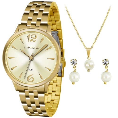 Relógio feminino com sistema analógico com ponteiros indicando as horas, minutos e segundos. Caixa em metal com vidro em cristal mineral, possui ponteiros indicadores numerosos e tracejados, pino para ajuste de horas. Pulseira em aço trabalhado com fechamento por fivela de pressão.  Acompanha um kit com colar, um par de brincos, detalhe de pérola sintética.  - Resiste à água: 5ATM - Composição do Vidro: cristal mineral - Material da Caixa: metal  - Material da Pulseira: aço   Medidas aproximadas:  - Largura da caixa, incluindo pino: 4,4cm  - Diâmetro do visor: 4,0cm  - Espessura da caixa: 0,7cm  - Comprimento da pulseira: 24cm  Informações Adicionais:  Tamanho: único Cor: dourado Modelo: Kit Relógio Feminino Lince LRGH047L KT91C2KX  Material: aço Detalhes adicionais: kit colar, par de brincos, Pérola sintética