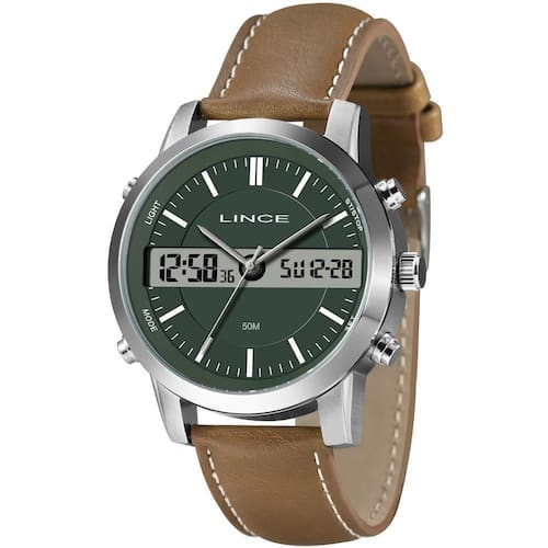 Relógio Lince Masculino Ref: Mac4763l46 E1nx Anadigi Prateado DESCRIÇÃO DO PRODUTO: Marca: Lince Gênero: Masculino Vidro: Cristal Mineral Funções: Anadigi, Calendário, Cronógrafo, Alarme, Iluminação Resistência à Água: 50 m Características: com caixa metal e pulseira de Couro Ecológico Marrom Diâmetro da Caixa: 46 mm Fundo Parafusado Alimentação do Maquinário: Bateria Mostrador Verde Garantia de 1 ano