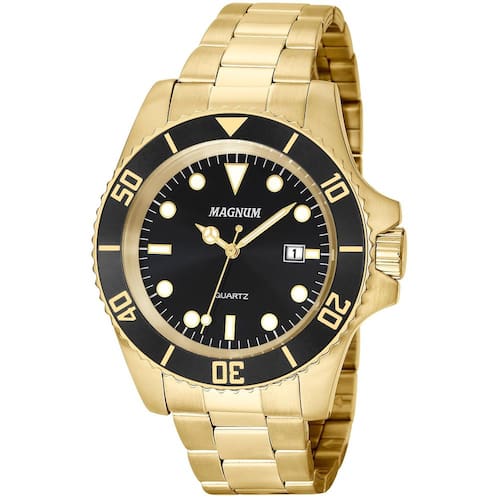 Detalhes do produto Relógio Magnum masculino com caixa e pulseira de aço. Clássico com toque de esportividade, este modelo possui banho dourado com acabamento polido e fosco. O destaque é o mostrador preto com calendário. Modelo resistente a água até 100 metros. Referência: Ma33068u Marca: Magnum Gênero: Masculino Mecanismo: Analógico Modelo: Sports - Classic Cor: Prata Material da pulseira: Aço Comprimento do relógio: 24 cm Tipo de fecho: Fecho dobrável com trava Pulseira ajustável: Sim Material da caixa: Aço Tamanho da caixa: Grande Formato da caixa: Redondo Dimensões da caixa: 4,4 cm Espessura da caixa: 1,3 cm Material do vidro: Cristal mineral Nível de resistência a água: 10 ATM Calendário: Sim Cronômetro: Não possui Alarme: Não possui Timer contador regressivo : Não possui Função chime bip de horas : Não possui Iluminação noturna: Não possui Fornecedor: Magnum Indústria da Amazônia S/A. CNPJ:63.715.510/0001-65 do fabricante: de 1 ano com o fornecedor.O que acompanha o produto: Estojo , Acessórios correspondentes a cada modelo , Manual em português, Certificado de do fabricante, eletrônica