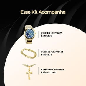 Relogio Masculino Aço Banhado + Pulseira + Cordão Grosso Social Casual Qualidade Premium Fundo Azul Relógio Masculino Dourado à Prova D\'água, Fundo Azul - Aço Inoxidável Banhado a Ouro 18k Adicione um toque de elegância ao seu visual com este relógio masculino dourado. Feito de aço inoxidável banhado a ouro 18k, este acessório durável possui resistência à água, sendo perfeito para uso diário, inclusive durante atividades aquáticas leves. Com um estilo sofisticado, este relógio é ideal para qualquer ocasião.
