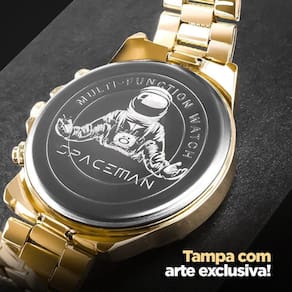 Além disso, a pulseira em aço inoxidável dourado estilo grumet oferece um toque de estilo adicional para realçar o visual. E para armazenar todos esses acessórios com segurança e elegância, a caixa premium Orizom Spaceman está incluída.