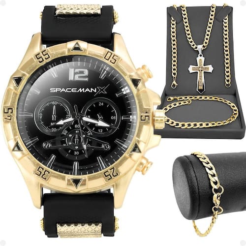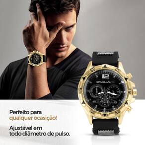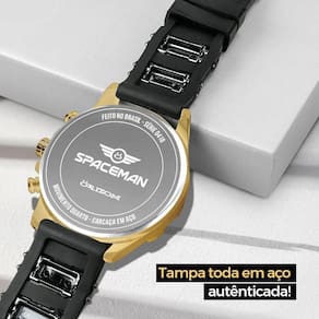 Relógio Analógico Masculino Orizom Spaceman X: Elegância e sofisticação se unem neste relógio com maquinário dourado, mostrador preto e pulseira em silicone ajustável. Um acessório que é muito mais do que um relógio, é uma declaração de estilo para o homem moderno.