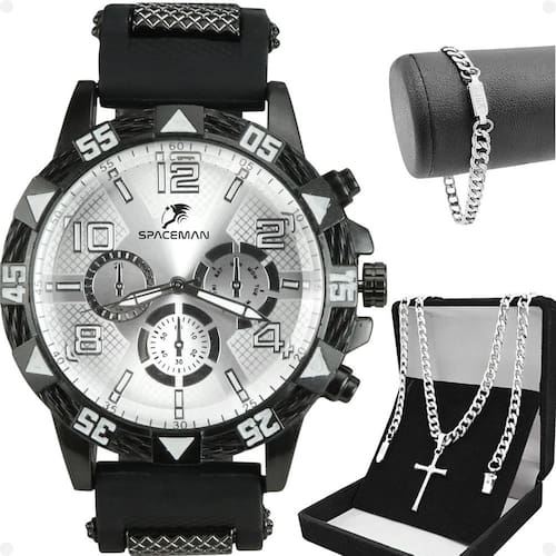 Kit de Acessórios Masculinos Orizom Spaceman - Relógio Analógico e Conjunto de Joias Banhadas!Relógio Analógico Masculino Orizom Spaceman- Marca: Orizom- Modelo: Spaceman- Prova d'água- Qualidade: Ultra Premium- Maquinário: Dourado banhado- Material: Aço inoxidável- Mostrador: Dourado com números de fácil leitura- Tampa: Blindada com arte em forma de astronauta Orizom Spaceman e detalhes de autenticidade- Pulseira: Silicone, ajustável, adequada para qualquer tamanho de pulsoCordão Grumet Banhado- Material: Banhado- Comprimento: Aproximadamente 65 cmPingente Banhado em Formato de Crucifixo- Material: Banhado- Detalhe: Oração do Pai Nosso gravada a laser de alta precisãoPulseira Banhada- Estilo: Correspondente ao cordão Grumet- Comprimento: Aproximadamente 21 cmEste kit é a escolha ideal para homens que valorizam acessórios de qualidade e design requintado. Perfeito para presentear alguém especial ou para um auto presente, o relógio Orizom Spaceman proporciona uma combinação de funcionalidade e estilo, enquanto o conjunto de joias banhadas acrescenta um toque de elegância e significado. Ideal para uso diário ou em ocasiões especiais, este kit garantirá que você ou o presenteado destaquem-se com acessórios sofisticados e bem coordenados. Aproveite essa oportunidade e adquira já o seu!