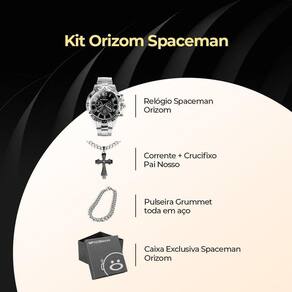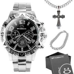 Relogio Masculino Aço Inox + Pulseira + Caixa Analogico Casual Preto Presente Social Kit Relógio Orizom Spaceman Aço Inox + Cordão + Pulseira Pai Nosso