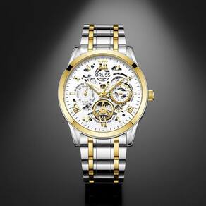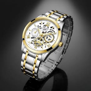 Relógio masculino de luxo com acabamento em prata e detalhes dourados. Possui mostrador branco com design esqueleto, pulseira em aço inoxidável e marcadores romanos que dão um toque sofisticado. Ideal para compor looks elegantes no dia a dia ou em ocasiões especiais.