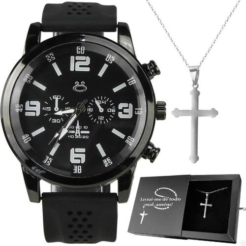 Relogio Masculino Aço Preto + Colar Crucifixo + Caixa Prata Social Pesado Ajustavel Robusto Kit de Acessórios Masculino Orizom - Linha Jesus na Cruz
