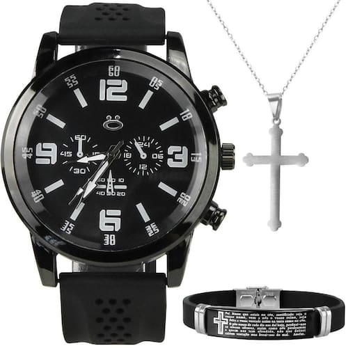 Este incrível kit masculino Orizom é a combinação perfeita de estilo, qualidade e espiritualidade, ideal para quem busca um visual sofisticado e cheio de significado. Composto por um relógio premium, cordão, pingente em forma de cruz e uma pulseira com oração, este conjunto é a escolha ideal para homens que apreciam acessórios exclusivos e repletos de simbolismo.