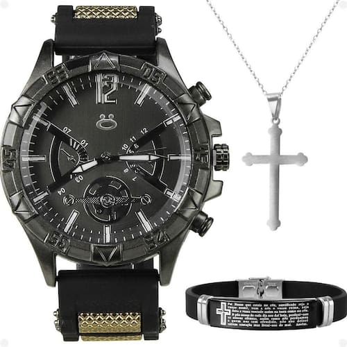 Relogio Masculino Aço Preto + Colar Crucifixo Robusto Religioso Oração Pai Nosso Prata Ajustavel Kit de Acessórios Masculino Orizom - Linha Oração do Pai Nosso Este sofisticado kit de acessórios masculinos da marca Orizom é a combinação perfeita de estilo, qualidade e espiritualidade. Composto por um relógio premium, cordão, pingente em forma de cruz e uma pulseira com oração, este conjunto exclusivo oferece sofisticação e significado em cada peça, sendo ideal para presentear ou para uso próprio.