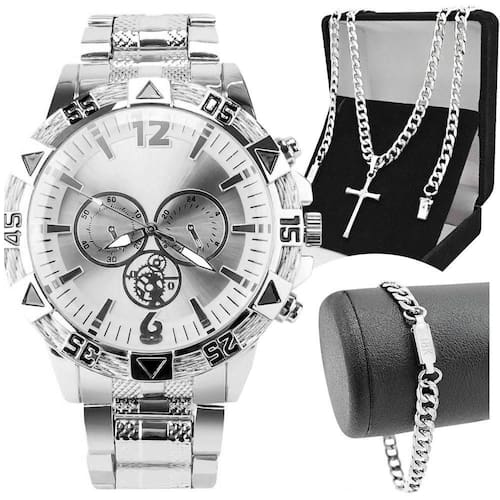 Relogio Masculino Aço Prova Dagua + Pulseira + Cordão Cruz Inoxidável Casual Qualidade Premium Prata Kit Orizom Spaceman - Relógio Masculino + Corrente + Pingente + Pulseira Apresentamos o Kit Orizom Spaceman, uma combinação impressionante de estilo e elegância que é perfeita para presentear em qualquer ocasião especial. Este conjunto exclusivo apresenta uma variedade de peças de alta qualidade, tudo em aço inoxidável durável e sofisticado.