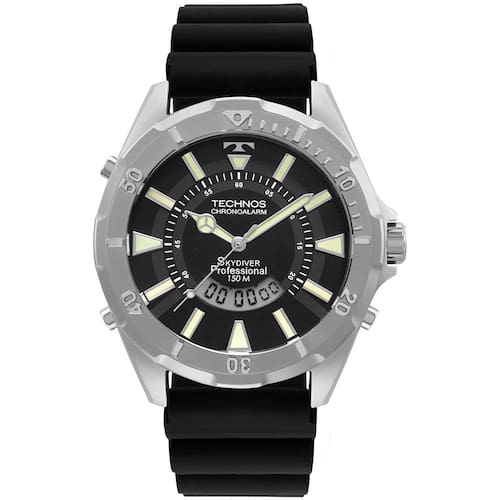 Relógio Technos Masculino Skydiver, um ícone da marca Technos. Um ícone da marca Technos, o modelo possui características inconfundíveis, como o seu display digital em formato de sorriso. Resistente à água em até 150 metros, conta com pulseira em borracha e caixa em aço.
