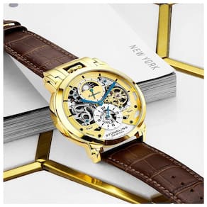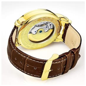 MOVIMENTO DE MESMERIZAÇÃO Mostrador esqueletizado gravado e transparente e fundo de exibição com o Menai 906 permite que você observe em seu pulso enquanto o mecanismo interno marca a passagem do tempo NÃO É NECESSÁRIO BATERIAS O movimento automático de 22 joias mecânico de corda automática utiliza seu movimentos naturais para manter seu relógio funcionando enquanto você o usar DUAL TIME , AM PM mantenha o controle de 2 fusos horários separados com subdial GMT funcional, controle também noite e dia com o subdial Sol , Lua FAIXA DE COURO GENUÍNA Concluída com uma luxuosa pulseira de couro de crocodilo marrom de em relevo, o 906 combina estilo nítido com conforto inacreditável.