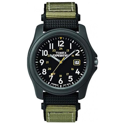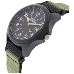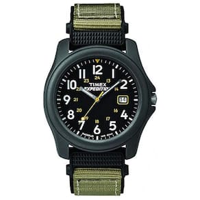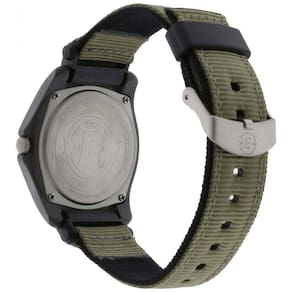 importado. Alça ajustável de náilon cinza esverdeada de se ajusta a uma circunferência de pulso de até . Fivela, Fecho Gancho e laço. Mostrador preto com janela de data às 3 horas algarismos arábicos completos. Caixa de resina cinza de com lente acrílica. Mostrador de relógio iluminado Indiglo mãos luminosas. Resistente à água até 50m 165 pés Em geral, adequado para curtos períodos de natação recreativa, mas não mergulho ou snorkeling