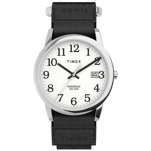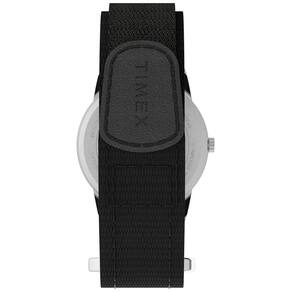 Alça preta ajustável FastWrap de com fecho de fecho aderente que se encaixa na circunferência do pulso de até 8 polegadas Mostrador branco de fácil leitura com algarismos arábicos pretos janela de data às 3 horas Caixa de latão prateado de com cristal de vidro mineral Indiglo light up mostrador do relógio Resistente à água até 30m 100 pés em geral, resiste a respingos ou breve imersão em água, mas não é adequado para nadar ou tomar banho Marca: Não Informado