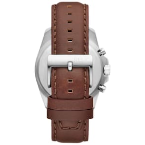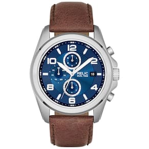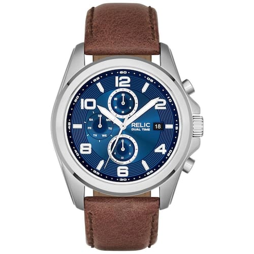 Tamanho da caixa 44mm Tamanho da faixa 24mm movimento de quartzo com display analógico luminoso de 3 ponteiros face de cristal mineral importado. Caixa de aço inoxidável com mostrador texturizado azul. Pulseira de couro marrom com fecho de fivela de aço inoxidável. Exibição de tempo duplo calendário janela de data submostrador de dia. Resistente à água até 100 pés 30M suporta respingos ou breve imersão na água, mas não é adequado para nadar ou tomar banho