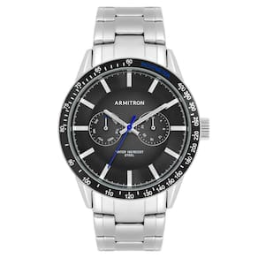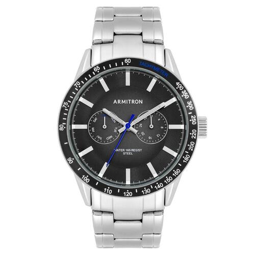 Relógio masculino Armitron com mostrador preto analógico multizona em tom prateado, 20/5576BKSV - Lente de cristal mineral; moldura preta com taquímetro prateado - Mostrador multizona prateado com dia e data; ponteiros e marcadores luminosos prateados - Pulseira de aço inoxidável prateado; fecho dobrável com botão duplo de segurança - Resistente à água até 165 pés (50M)