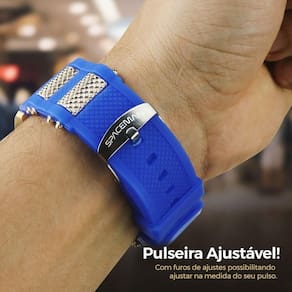 Pulseira: Silicone azul ajustável, adaptável a qualquer dimensão de pulso para máximo conforto