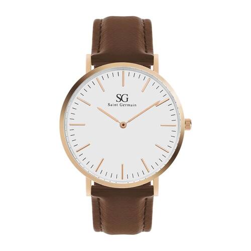 O Relógio Minimalista Saint Germain Marrom Pulseira de Couro Bronx Rosé Gold 40mm com pulseira de couro sintético marrom possui 40mm de diâmetro. A caixa é metal rosé gold e o mostrador branco, vidro com mineral endurecido com alta resistência.