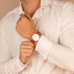 O design minimalista do Bronx com um mostrador branco e com a pulseira marrom é uma combinação emocionante e elegante.