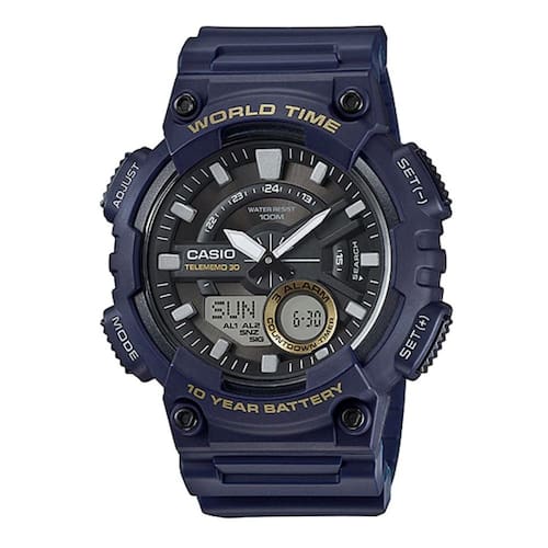 Muita praticidade e estilo estão presentes no Relógio Masculino Casio AEQ-110W-2AVDF Azul. Além de contar com toda a qualidade dos produtos da Casio, o item é produzido em resina resistente e possui resistência a agua, o que permite que você use e abuse sem medo de se aventurar. Informações Básicas - Marca: Casio - Referência: AEQ-110W-2AVDF - Gênero: Masculino - : 1 Ano em Toda Rede de Assistência Técnica Casio no Brasil Características - Composição do Vidro: Cristal Mineral - Material da Caixa: Resina - Cor da Caixa: Preto, Azul - Material da Pulseira: Resina - Cor da Pulseira: Azul Medidas - Diâmetro da Caixa: 4,6cm Resistência a Água - WR: 100Mts - Pode Lavar as Mãos: SIM - Pode Usar em Água Corrente: SIM - Pode Usar na Piscina: SIM - Pode Usar em Mergulho Profundo: NÃO Funções Especiais - Bateria com duração de 10 anos - Hora mundial - Telememo 30 - Cronômetro de 1/100 de segundo - Alarmes Conteúdo Da Embalagem: 01 Relógio Masculino Casio AEQ-110W-2AVDF Azul Caixa Certificado De Sobre a Casio: A Casio Computer Co., Ltd. é um dos fabricantes líder no mercado mundial de produtos eletrônicos ao consumidor e de soluções de equipamentos empresariais. Desde sua fundação, em 1957, a CASIO vem trabalhando para manter o princípio de "criatividade e contribuição" da corporação, lançando produtos inovadores. Ean: 4549526112409