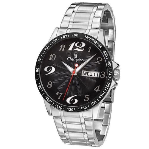 Relógio Masculino Champion Ca31159T Compre o Relógio Masculino Champion CA31159T. O relógio possui mecanismo Analógico e a pulseira é na cor Prata, fabricada em Metal, com 23 cm de comprimento. A Caixa peça onde fica o mostrador é fabricada em Metal e mede 4,5 cm de diâmetro. O Relógio Masculino Champion CA31159T tem nível de resistência à água especificado em 05 ATM. Acompanha manual de instruções e certificado de garantia do fabricante. Ficha técnica - Calendário: Sim - Resistência à Água: 05 ATM - Material da Pulseira: Metal - Cronógrafo: Não - Gênero: Masculino - Mecanismo: Quartz - Cor da Caixa: Preto - Material da Caixa: Metal - Cor do Mostrador: Preto - Alarme: Não - Diâmetro da Caixa: 4,5 cm - Estilo: Sociais - Cor da Pulseira: Prata - Display: Analógico - Vidro do Relógio: Cristal - Comprimento da Pulseira: 23 cm